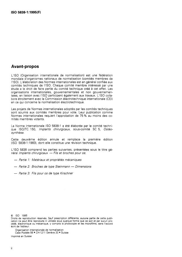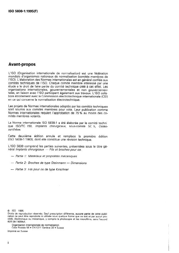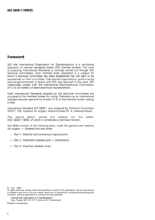 ISO 5838-1:1995 is a standard published by the International Organization for Standardization (ISO). Its full title is "Implants for surgery — Skeletal pins and wires — Part 1: Material and mechanical requirements". This standard covers: Specifies materials and mechanical requirements for skeletal pins and wires for use in bone surgery, excluding wires for binding and twisting. Replaces the first edition, of which it constitutes a technical revision.