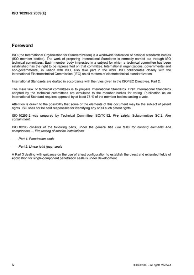 ISO 10295-2:2009 is a standard published by the International Organization for Standardization (ISO). Its full title is "Fire tests for building elements and components - Fire testing of service installations - Part 2: Linear joint (gap) seals". This standard covers: ISO 10295-2:2009 specifies the heating conditions, methods of test and criteria for the evaluation of the ability of a linear joint seal to maintain the fire integrity and thermal insulation of a fire-separating element at the joint being sealed. The purpose of the tests is to assess the integrity and insulation performance of the linear joint seals, including the effects of induced movement in those cases where the joint is designed to accommodate movement and has a width greater than 20 mm. It is not the intention of this part of ISO 10295-2:2009 to provide quantitative information on the rate of leakage of smoke and/or gases, or on the transmission or generation of fumes, although such phenomena can be recorded in describing the general behaviour of specimens during the test. It is not the intention of this part of ISO 10295-2:2009 to evaluate joint seals where special test procedures already exist, e.g. doors, partitions, penetrations, pipes, ducts and cables.