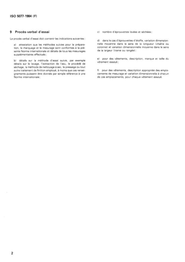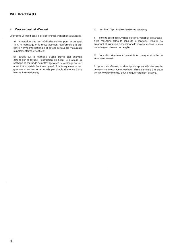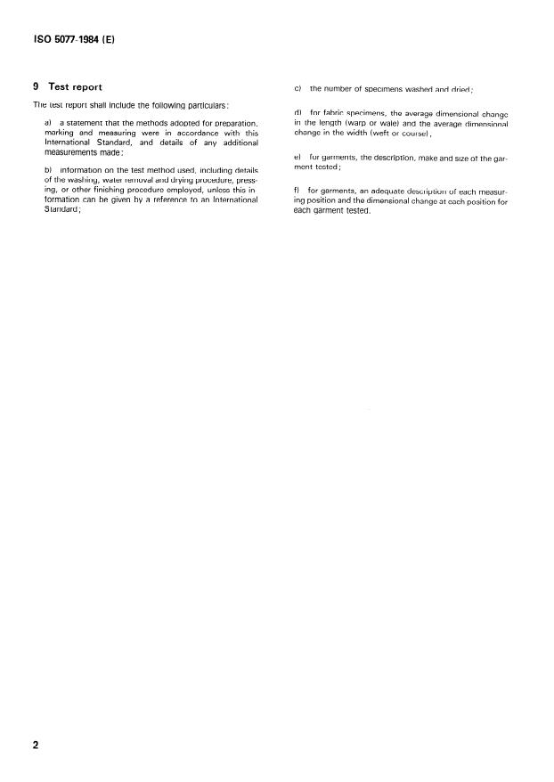 ISO 5077:1984 is a standard published by the International Organization for Standardization (ISO). Its full title is "Textiles — Determination of dimensional change in washing and drying". This standard covers: Applicable to fabrics, garments or other textile articles when subjected to an appropriate combination of specified washing and drying procedures. In the case of textile articles or deformable materials it is necessary to exercise all possible caution in the interpretation of the results.