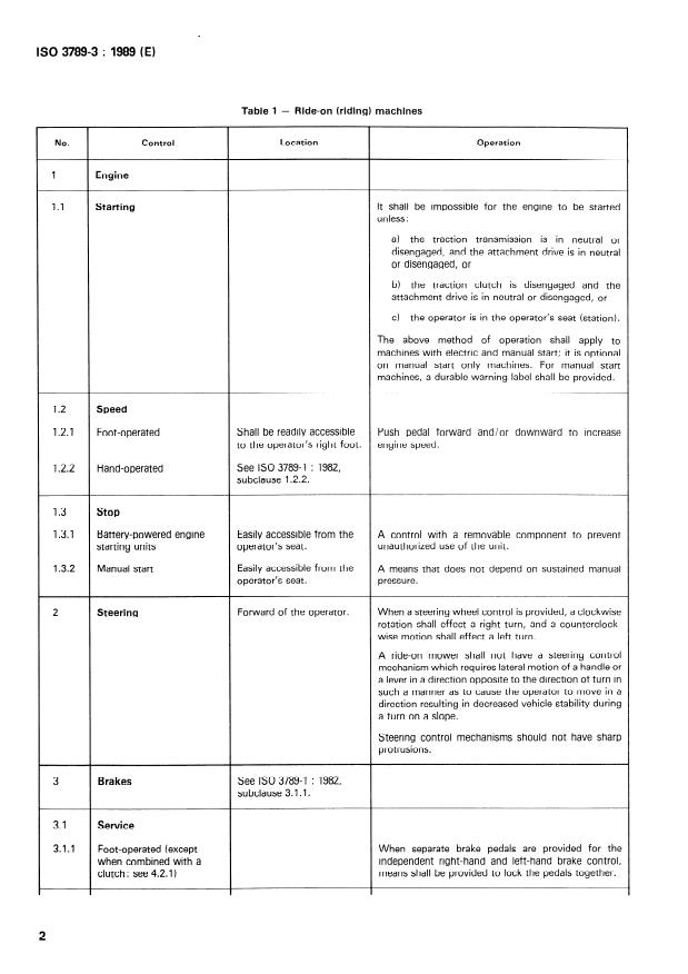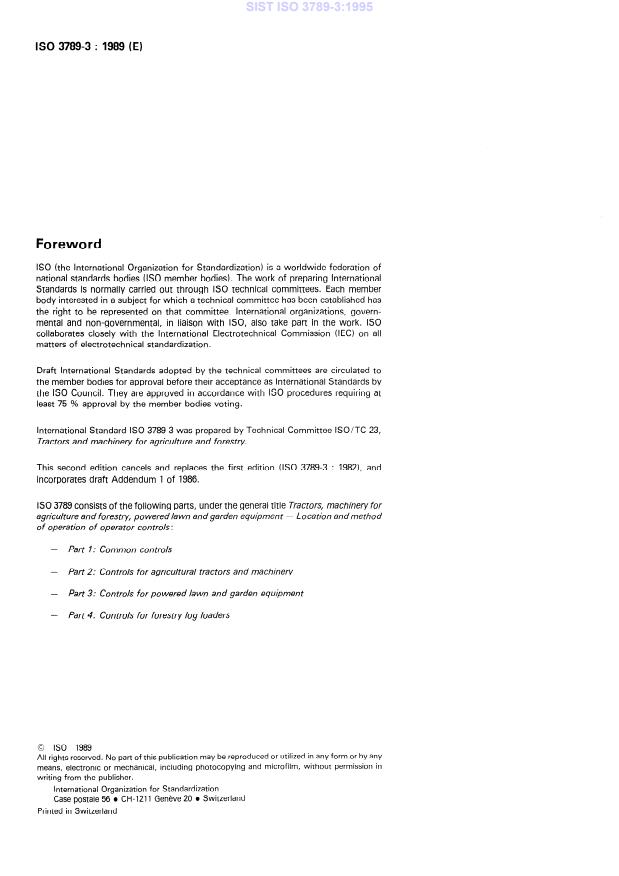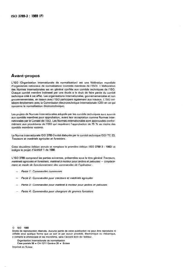 ISO 3789-3:1989 is a standard published by the International Organization for Standardization (ISO). Its full title is "Tractors, machinery for agriculture and forestry, powered lawn and garden equipment — Location and method of operation of operator controls — Part 3: Controls for powered lawn and garden equipment". This standard covers: This second edition cancels and replaces the first edition (1982). Specifies the type, location and method of operation (including direction of motion) of controls for equipment having a width of cut greater than 300 mm. The controls are divided two categories: - ride-on machinery; - pedestrian-operated machines. The control location and method of operatio in this part are supplementary to the requirements established in ISO 3789/1. The controls included in this part are those are located at the operator's normal working position.