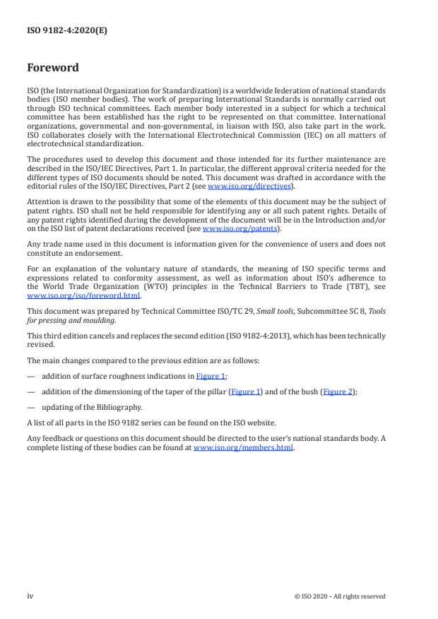 ISO 9182-4:2020 is a standard published by the International Organization for Standardization (ISO). Its full title is "Tools for pressing — Guide pillars — Part 4: Type C, pillars with taper lead and bush". This standard covers: This document specifies the dimensions and tolerances of guide pillars, type C, with taper lead and bush, intended for use in press tools. It gives guidance on the materials and specifies the hardness and the designation of guide pillars which meet the requirements of this document.