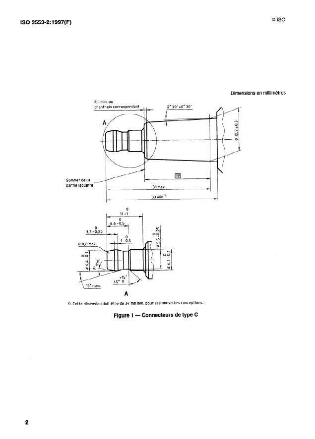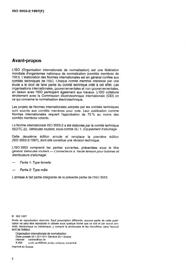 - ISO 3553-1 - Road vehicles - High-tension connectors for ignition coils and distributors - Part 1: Female types. This complementary document defines the specifications for female connectors that mate with the male plug-types in ISO 3553-2.