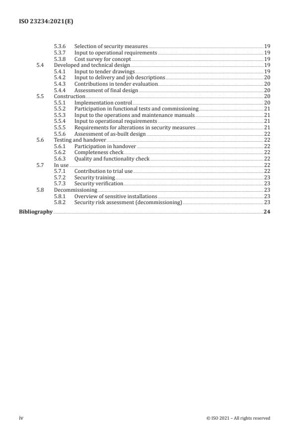 ISO 23234:2021 is a standard published by the International Organization for Standardization (ISO). Its full title is "Buildings and civil engineering works — Security — Planning of security measures in the built environment". This standard covers: This document provides requirements and recommendations for effective planning and design of security measures in the built environment. The purpose of the document is to achieve optimal protection of assets against all kinds of malicious acts, while ensuring functional, financial, and aesthetic aspects. The document describes which methods and routines need to be implemented in various stages of a building or civil engineering works project, as well as the competencies needed to achieve a good result. This document is applicable to new builds, refurbishments and development projects by government and private entities, for various environments, buildings and infrastructure.