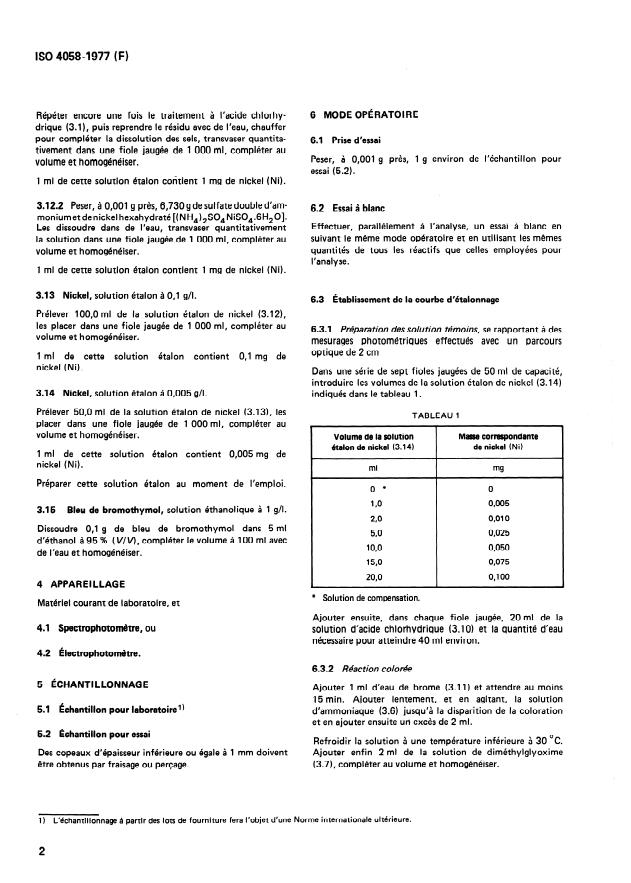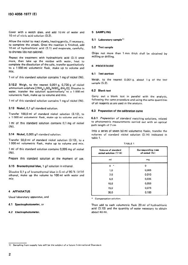 ISO 4058:1977 is a standard published by the International Organization for Standardization (ISO). Its full title is "Magnesium and its alloys — Determination of nickel — Photometric method using dimethylglyoxime". This standard covers: The method is applicable to the determination of nickel contents between 0,000 5 and 0,05 % (m/m). Specifies principle, reagents, apparatus, sampling, procedure, expression of results and test report.