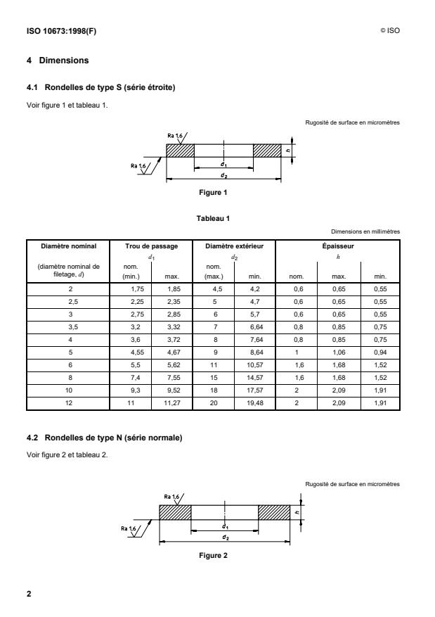 ISO 10673:1998 is a standard published by the International Organization for Standardization (ISO). Its full title is "Plain washers for screw and washer assemblies — Small, normal and large series — Product grade A". This standard covers: La présente Norme internationale prescrit les caractéristiques des rondelles métalliques plates, des séries étroite, normale et large, de grade A et de classes de dureté 200 HV et 300 HV pour les vis à filetage métrique avec rondelle incorporée conformes à l'ISO 10644.