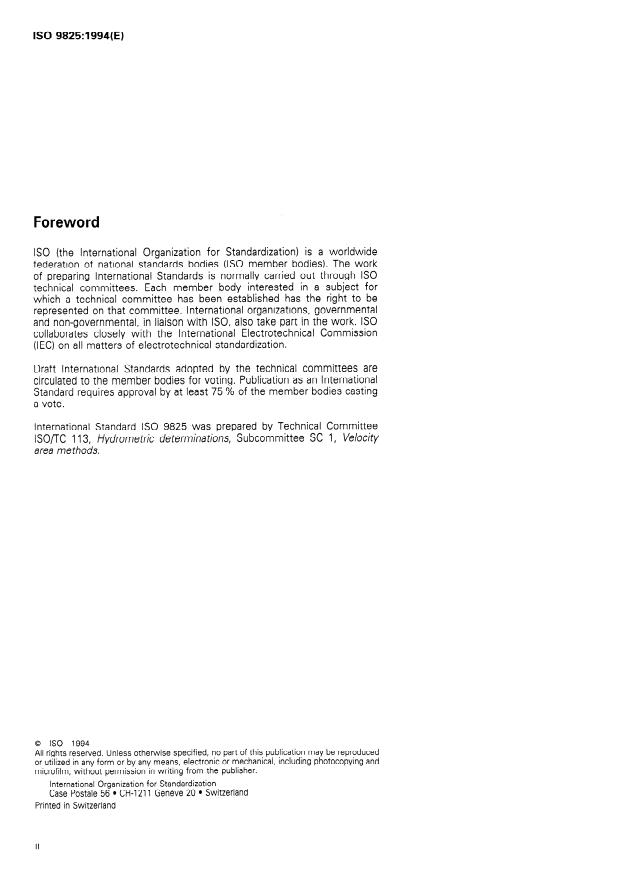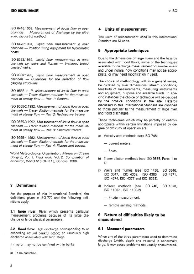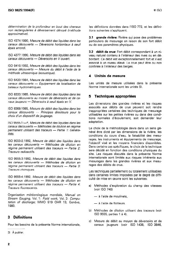ISO 9825:1994 is a standard published by the International Organization for Standardization (ISO). Its full title is "Measurement of liquid flow in open channels — Field measurement of discharge in large rivers and floods". This standard covers: Deals specifically with the measurement of discharge in large rivers and the measurement of flood flows. Also describes the relevant field measurements when it becomes necessary to use indirect methods of estimating discharge.