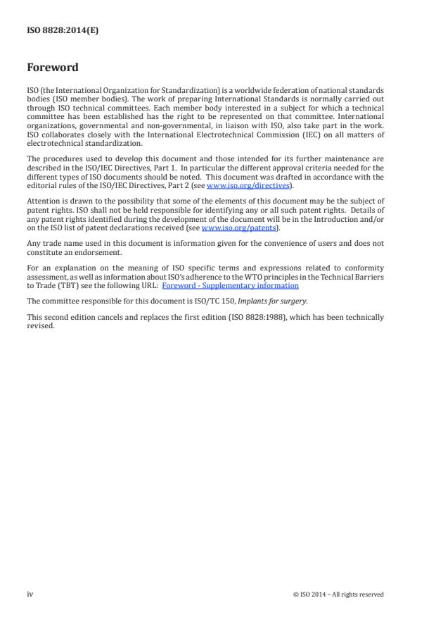 ISO 8828:2014 is a standard published by the International Organization for Standardization (ISO). Its full title is "Implants for surgery — Guidance on care and handling of orthopaedic implants". This standard covers: ISO 8828:2014 specifies the recommended procedures for handling orthopaedic implants, hereafter referred to as implants, from receipt at the hospital until they are implanted or discarded. This guidance applies to implants (such as currently used metal, ceramic, or polymeric implants) and also to acrylic resin and other bone cements. This guidance does not apply to the implant manufacturer. However, it contains references to the stocking of implants that can be useful for manufacturers and especially for third-party suppliers.