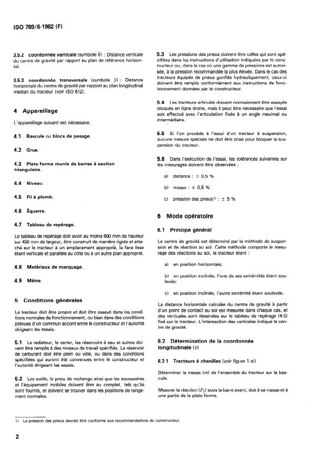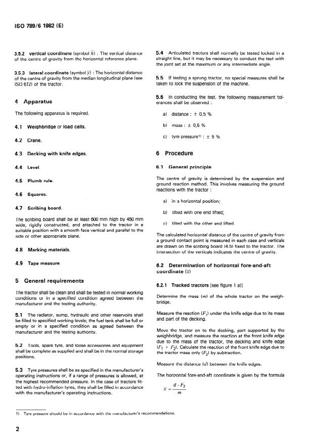 ISO 789-6:1982 is a standard published by the International Organization for Standardization (ISO). Its full title is "Agricultural tractors — Test procedures — Part 6: Centre of gravity". This standard covers: Specifies a simple, practical method, which requires the use of a weighbrindge and crane. Alternative methods may be used if they locate the centre of gravity with respekt to the specified reference planes and within the specified tolerances. The method is applicable to tractors having at least axles fitted with wheels or tracks. Three figures illustrate the determination in the different coordinates. An annex gives the specimen test report.