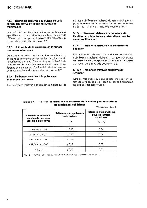 Tableau 1 - Tolérances relatives à la puissance de la surface pour les surfaces