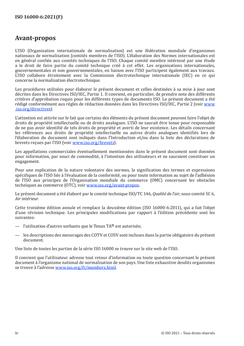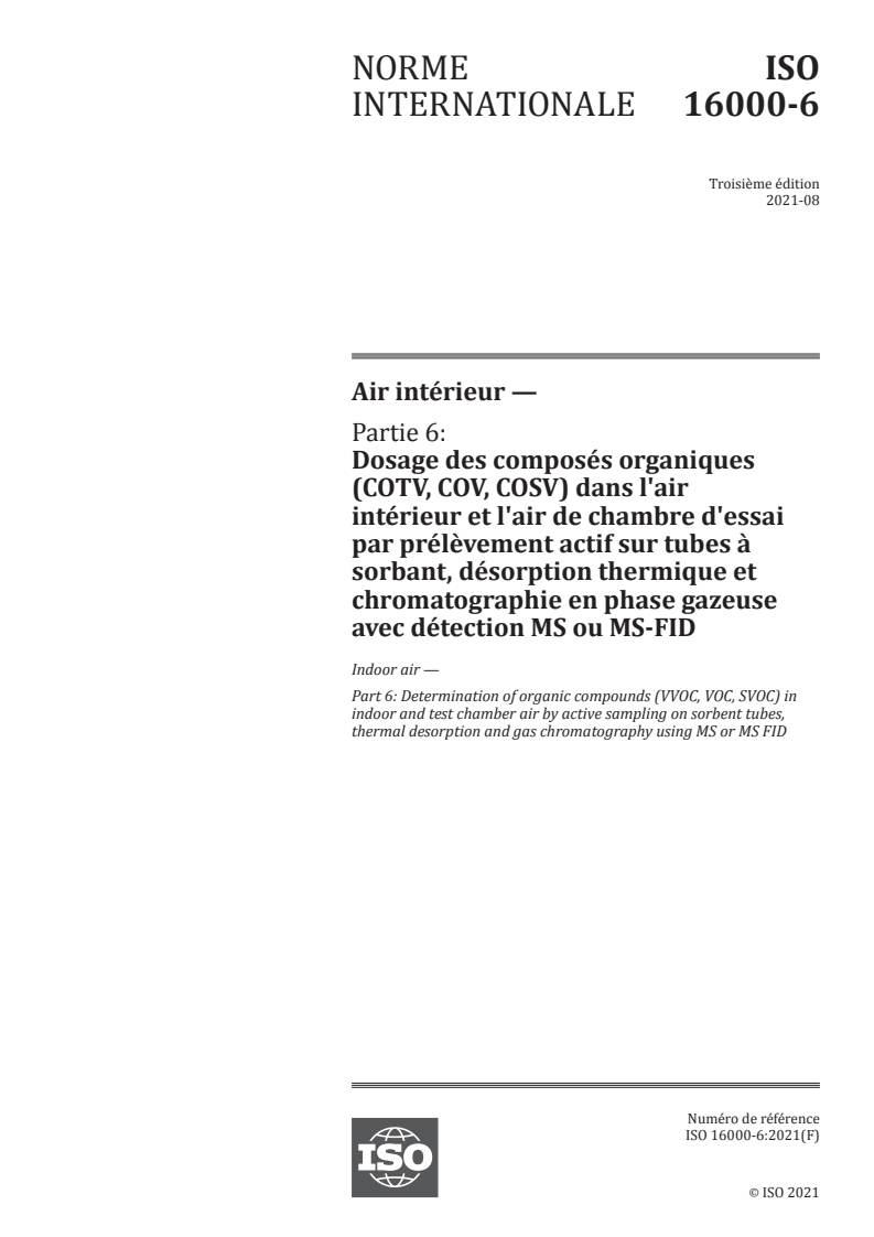 ISO 16000-6:2021 - Air intérieur — Partie 6: Dosage des composés organiques (COTV, COV, COSV) dans l'air intérieur et l'air de chambre d'essai par prélèvement actif sur tubes à sorbant, désorption thermique et chromatographie en phase gazeuse avec détection MS ou MS-FID Released:8/20/2021