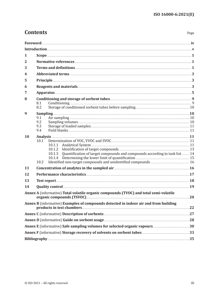 ISO 16000-6:2021 - Indoor air — Part 6: Determination of organic compounds (VVOC, VOC, SVOC) in indoor and test chamber air by active sampling on sorbent tubes, thermal desorption and gas chromatography using MS or MS FID Released:8/20/2021