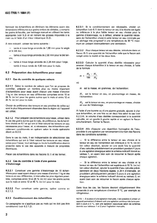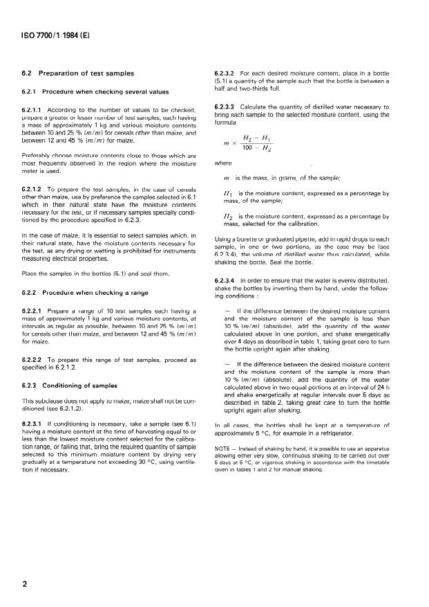 ISO 7700-1:1984 is a standard published by the International Organization for Standardization (ISO). Its full title is "Check of the calibration of moisture meters — Part 1: Moisture meters for cereals". This standard covers: The method is applicable to oats, durum wheat, wheat, maize, barley, rice, rye and sorghum. It consists in preparing of several test samples, or a range of test samples, with different moisture contents, under specified conditions, determining of their moisture contents by a reference method and measuring with the meter to be checked. An annex specifies the maximum permitted errors.