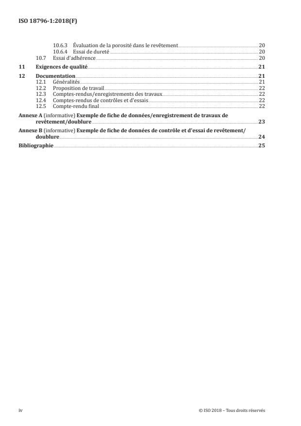 ISO 18796-1:2018 is a standard published by the International Organization for Standardization (ISO). Its full title is "Petroleum, petrochemicals and natural gas industries — Internal coating and lining of carbon steel process vessels — Part 1: Technical requirements". This standard covers: This document specifies the minimum technical requirements for surface preparation, materials, application, inspection and testing of internal coating and lining systems that are intended to be applied on internal surfaces of process vessels that are subject to marked pressure/temperature changes and/or potentially corrosive conditions or processes and aggressive chemicals, used in the oil and gas industry. This document covers both new construction and maintenance works of process vessels as well as the repair of defective and deteriorated coating and lining systems. This document also provides the minimum requirements for the coated and lined samples and the criteria for their approval.