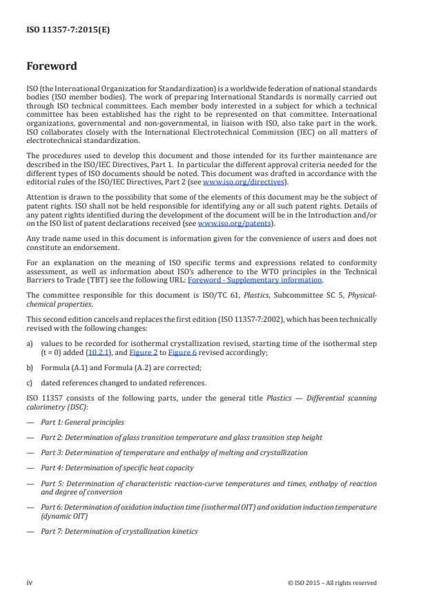 ISO 11357-7:2015 is a standard published by the International Organization for Standardization (ISO). Its full title is "Plastics — Differential scanning calorimetry (DSC) — Part 7: Determination of crystallization kinetics". This standard covers: ISO 11357-7:2015 specifies two methods (isothermal and non-isothermal) for studying the crystallization kinetics of partially crystalline polymers using differential scanning calorimetry (DSC). It is only applicable to molten polymers. NOTE These methods are not suitable if the molecular structure of the polymer is modified during the test.