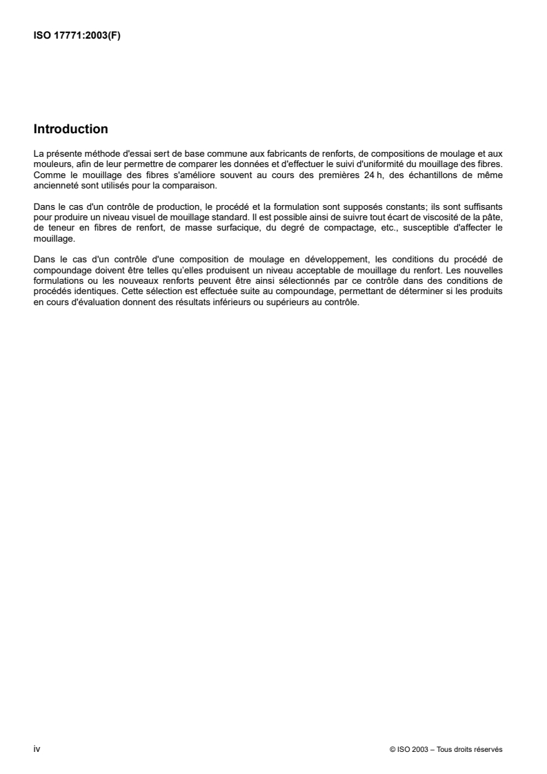 ISO 17771:2003 - Plastiques — Compositions de moulages à base de thermodurcissables — Détermination du taux de mouillage des fibres dans les SMC Released:30. 07. 2003