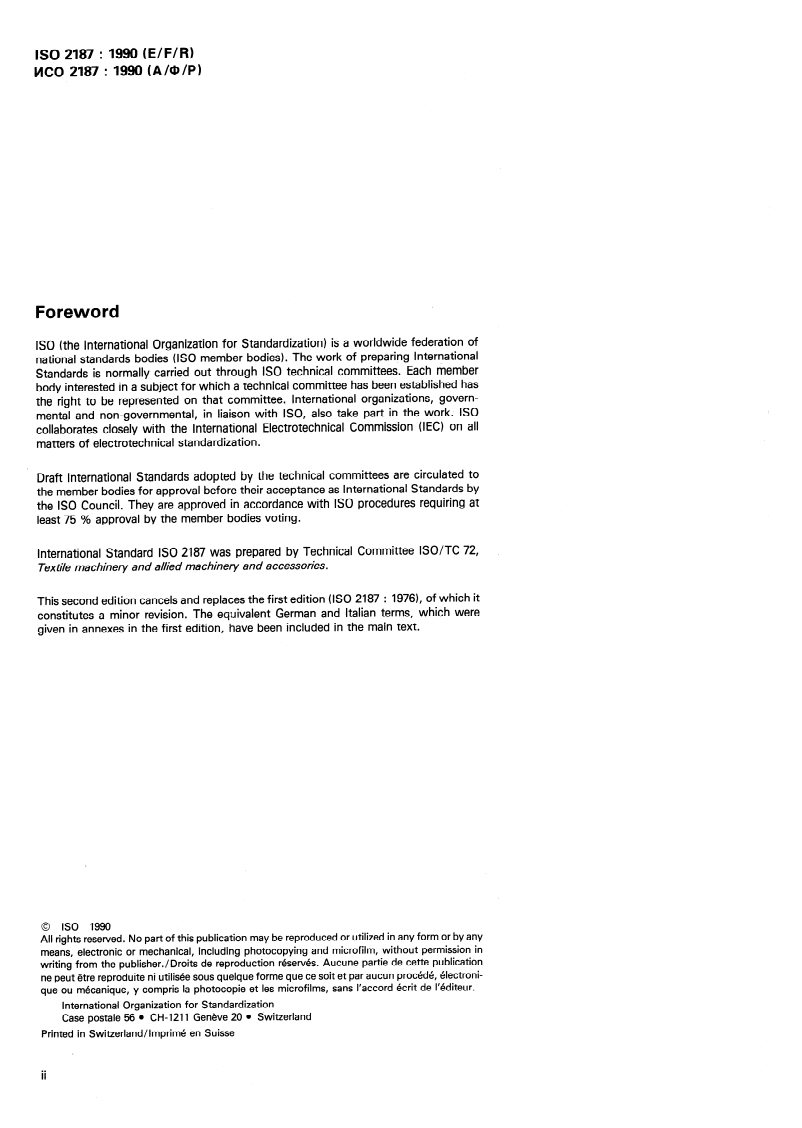 Keywords: ISO 2187:1990, spinning preparatory machinery, spinning and doubling machinery, textile machinery terminology, equivalent terms, cotton system, worsted system, rotor spinning, ring spinning, doubling machine.