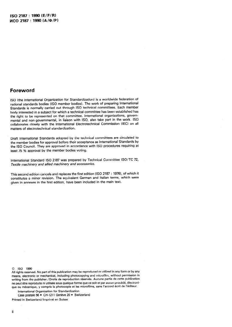 ISO 2187:1990 is a standard published by the International Organization for Standardization (ISO). Its full title is "Spinning preparatory machinery, spinning and doubling (twisting) machinery - List of equivalent terms". This standard covers: Gives terms relating to spinning preparatory machinery, spinning and doubling machinery for the following: cotton system; worsted system; semi-worsted system; woollen system; machines for man-made fibres; special machines. - Replaces the first edition (ISO 2187:1976) and constitutes a minor revision thereof.