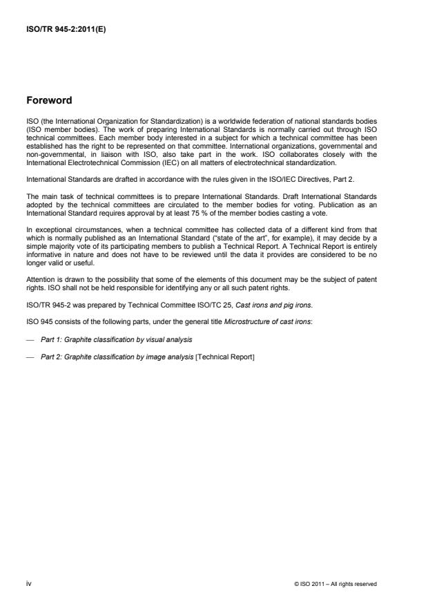 ISO/TR 945-2:2011 is a technical report published by the International Organization for Standardization (ISO). Its full title is "Microstructure of cast irons - Part 2: Graphite classification by image analysis". This standard covers: ISO/TR 945-2:2011 deals with the two-dimensional characterisation of graphite form and size in cast irons. A standard method for determining graphite form by image analysis had not been developed at the time of this report, but several methods are in use in the industry. The purpose of ISO/TR 945-2 is to give an illustration of what is possible and to suggest ways in which the technique might develop in the future. ISO/TR 945-2:2011 does not apply to the graphite distribution of grey (lamellar graphite) cast iron as defined in ISO 945-1. ISO/TR 945-2:2011 describes procedures used to carry out image analysis of graphite form and size and provides a method of comparison to the results obtained using visual analysis techniques. It does not specify any particular mathematical description of the graphite forms but provides a means for comparison.