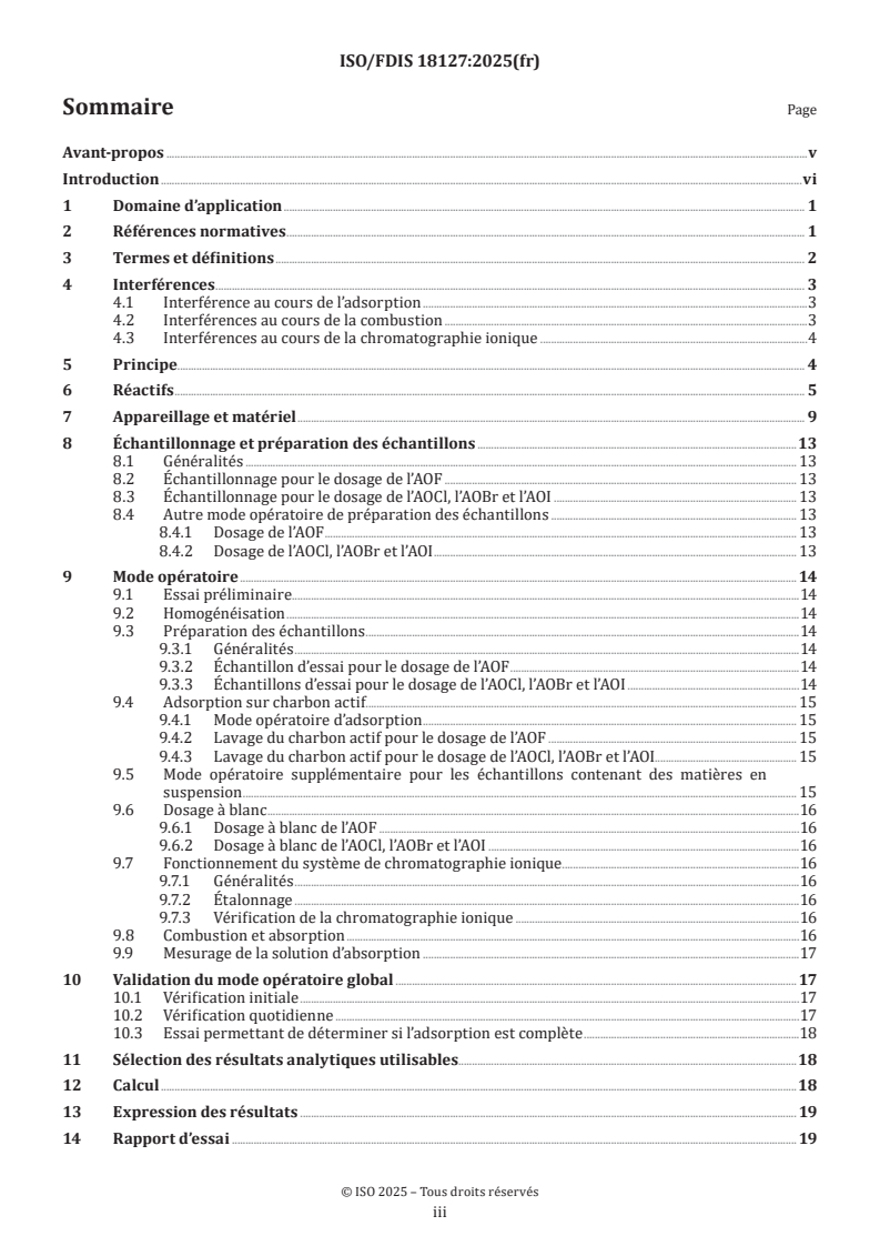 ISO/FDIS 18127 - Qualité de l’eau — Dosage des composés organiques adsorbables contenant du fluor, du chlore, du brome et de l’iode (AOF, AOCl, AOBr, AOI) — Méthode de combustion suivie d’un mesurage par chromatographie ionique Released:17. 09. 2025