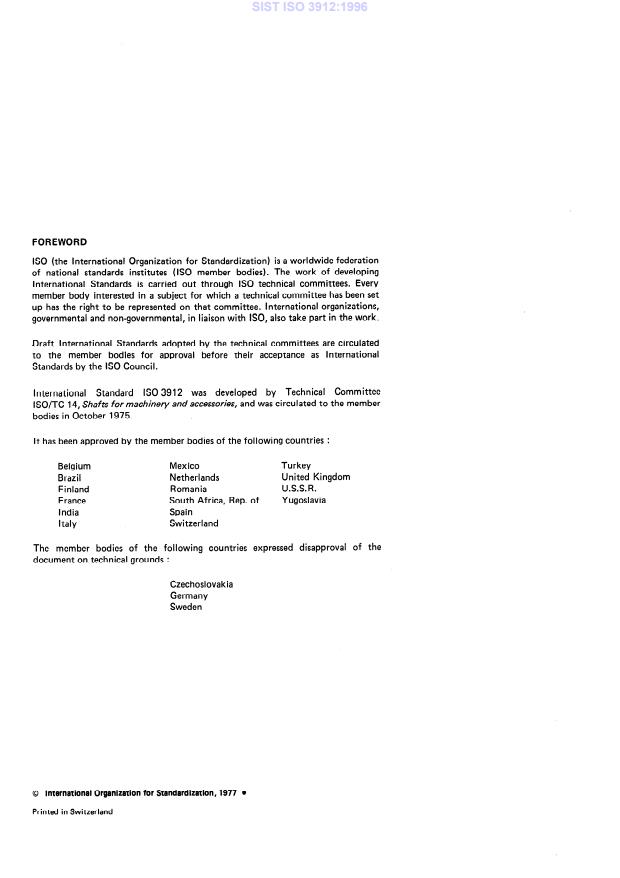 FOREWORD IS0 (the International Organization for Standardization) is a worldwide federation of national standards institutes (IS0 member bodies). The work of developing International Standards is carried out through IS0 technical committees. Every member body interested in a subject for which a technical committee has been set up has the right to be represented on that committee. International organizations, governmental and non-governmental, in liaison with ISO, also take part in the work. -Draft International Standards adopted by the technical committees are circulated to the member bodies for approval before their acceptance as International Standards by the IS0 Council. International Standard IS0 3912 was developed by Technical Committee ISO/TC 14, Shafts for machinery and accessories, and was circulated to the member bodies in October 1975. It has been approved by the member bodies of the following countries : Belgium Mexico Brazil Netherlands Finland Romania France South Africa, Rep. of India Spain Italy Switzerland Turkey United Kingdom U.S.S.R. Yugoslavia The mem ber bodies of the fol docu ment on technica grounds : lowing countries expressed disapproval of the Czechoslovakia Germany 0 International Organization for Standardization, 1977 l Printed in Switzerland SIST ISO 3912:1996