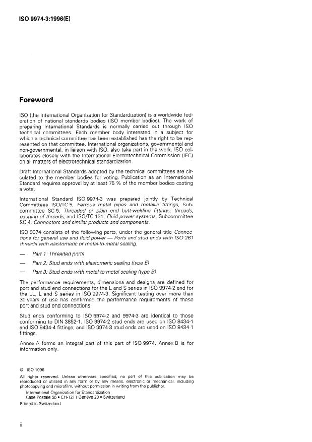 ISO 9974-3:1996 is a standard published by the International Organization for Standardization (ISO). Its full title is "Connections for general use and fluid power — Ports and stud ends with ISO 261 threads with elastomeric or metal-to-metal sealing — Part 3: Stud ends with metal-to-metal sealing (type B)". This standard covers: Specifies dimensions, performance requirements and test procedures for heavy-duty (S series), light-duty (L series) and extra-light-duty (LL series) stud ends with ISO 261 threads and metal-to-metal sealing. It also specifies the designation of these stud ends.