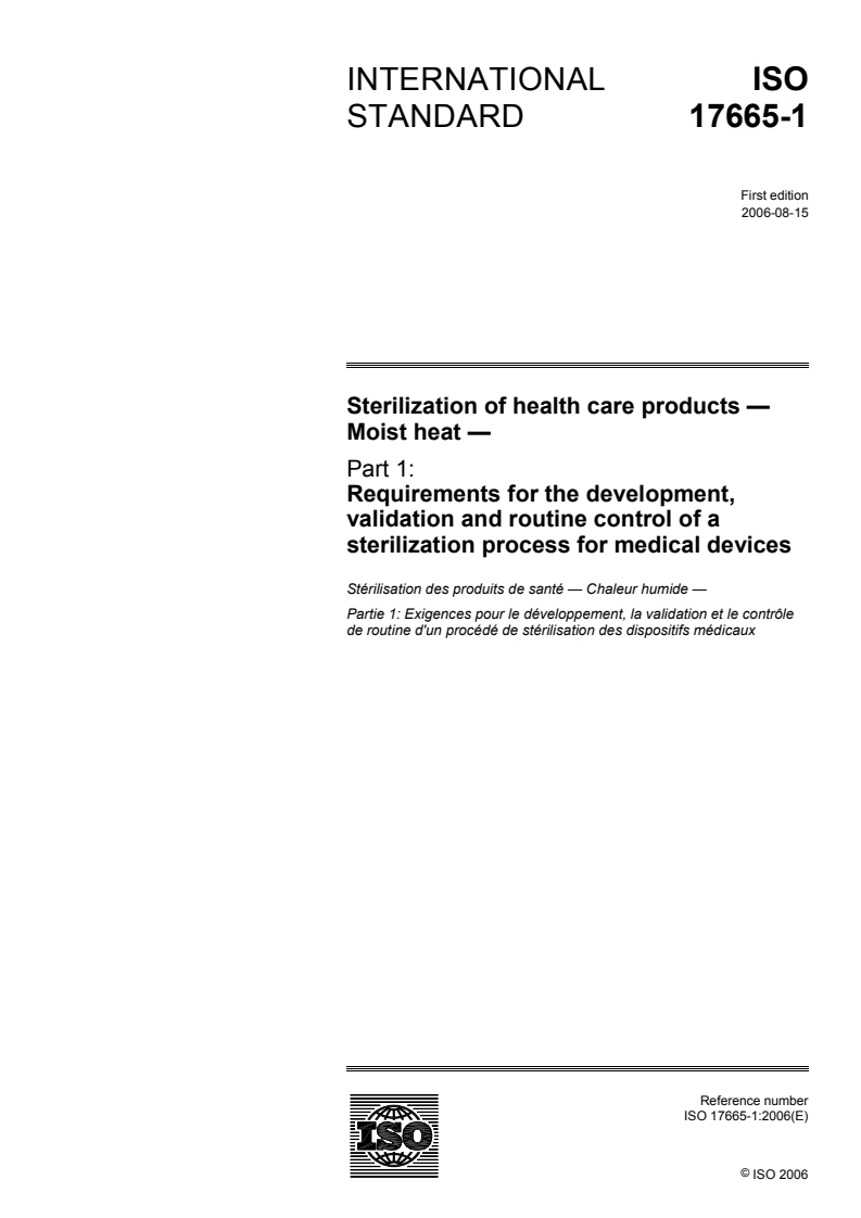 ISO 17665-1:2006 - Sterilization of health care products — Moist heat — Part 1: Requirements for the development, validation and routine control of a sterilization process for medical devices Released:8/17/2006