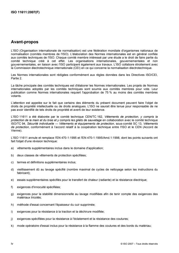 L'ISO 11611:2007 spécifie les exigences essentielles de sécurité minimales et les méthodes d'essai des vêtements de protection, comprenant les cagoules, les tabliers, les manches et les guêtres, destinés à protéger le corps y compris la tête (cagoules) et les pieds (guêtres) et qui doivent être portés durant des opérations de soudage et autres procédés techniques ayant des risques comparables. Pour la protection de la tête et des pieds, l'ISO 11611:2007 s'applique seulement pour les cagoules et les guêtres. L'ISO 11611:2007 ne couvre pas les exigences pour la protection de la main. Ce type de vêtement de protection est destiné à protéger celui qui le porte contre les projections (petites projections de métal en fusion), contre le contact de courte durée avec une flamme, contre la chaleur radiante provenant de l'arc et à fournir un certain degré d'isolation électrique en cas de contact accidentel avec un conducteur électrique à un voltage supérieur à approximativement 100 V en courant continu dans des conditions normales de soudage. La sueur, des salissures ou d'autres polluants peuvent affecter le niveau de protection apporté contre un contact accidentel avec un conducteur électrique à ces voltages. L'ISO 11611:2007 spécifie deux classes avec des exigences de performance, la Classe 1 étant la plus faible et la Classe 2 la plus élevée. La Classe 1 est la protection contre des techniques de soudage et les situations provoquant le moins de projections et une chaleur radiante faible. La Classe 2 est la protection contre les techniques de soudage et les situations provoquant plus de projections et une chaleur radiante plus élevée. Pour une protection complète adéquate contre les risques rencontrés par les soudeurs, il convient que des EPI couverts par d'autres normes soient portés en complément afin de protéger la tête, le visage, les mains et les pieds.
