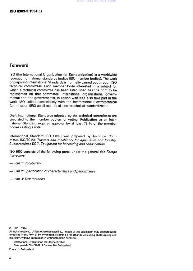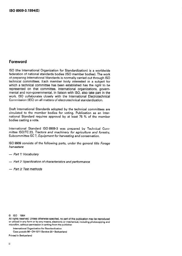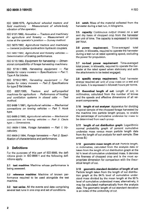 ISO 8909-3:1994 is a standard published by the International Organization for Standardization (ISO). Its full title is "Forage harvesters — Part 3: Test methods". This standard covers: Specifies test methods for evaluations of forage harvester function and performance, covering forage harvesters which cut the crop directly at full width or from spaced-apart plant rows, or which pickup precut crop. Applies to forage harvesters with driven knives for chopping and which deliver the chopped crop into a container or a separate vehicle or trailer. The harvesters may be tractor-mounted, trailed or self-propelled.