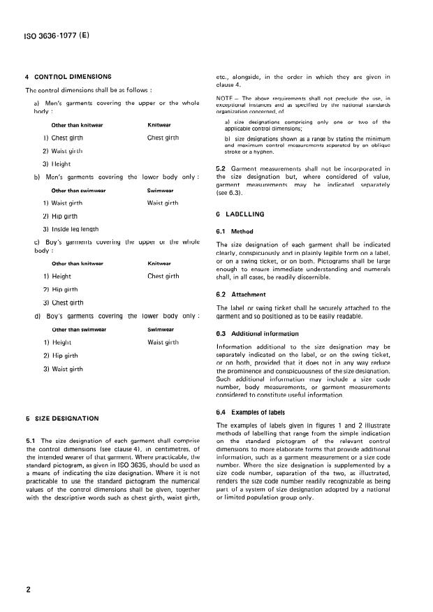 Establishes a system of designating the sizes of garments (including knitwear and swimwear) that are classified as a) covering the upper or the whole body or b) covering the lower body only, and applies to civilian and uniform garments. Both the control dimensions on which the size designation system is based, and the method of indicating the size designation on a garment label, are laid down. Should be read in conjunction with ISO 3635.
