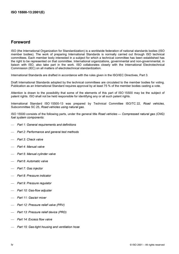 ISO 15500-13:2001 is a standard published by the International Organization for Standardization (ISO). Its full title is "Road vehicles — Compressed natural gas (CNG) fuel system components — Part 13: Pressure relief device (PRD)". This standard covers: Road vehicles — Compressed natural gas (CNG) fuel system components — Part 13: Pressure relief device (PRD)