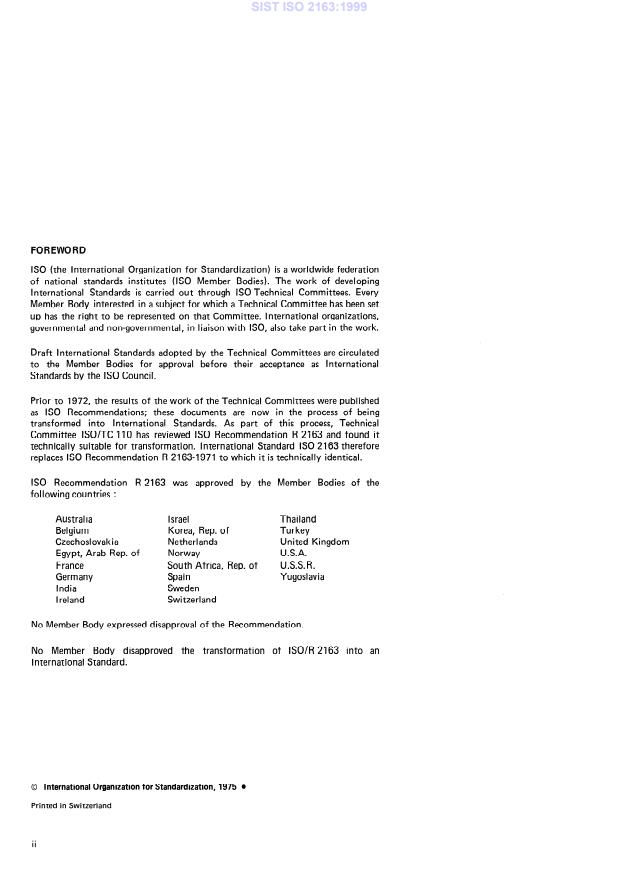 ISO (the International Organization for Standardization) is a worldwide federation of national Standards institutes (ISO Member Bodies). The work of developing International Standards is carried out through ISO Technical Committees. Every Member Body interested in a subject for which a Technical Committee has been set up has the right to be represented on that Committee. International organizations, governmenta! and non-governmental, in liaison with ISO, also take part in the work. Draft International Standards adopted by the Technical Committees are circulated to the Member Bodies for approval before their acceptance as International Standards by the ISO Council. Prior to 1972, the results of the work of the Technical Committees were published as ISO Recommendations; these documents are now in the process of being transformed into International Standards. As part sf this process, Technical Committee ISO/TC 110 has reviewed ISO Recommendation R 2163 and found it technically suitable for transformation. International Standard ISO 2163 therefore replaces ISO Recommendation R 2163-1971 to which it is technically identical. ISO Recommendation R 2163 was approved by the Member Bodies of the following countries : Austral ia Israel Belgium Korea, Rep. of Czechoslovakia Netherlands Egypt, Arab Rep. of Norway France South Africa, Rep. of Germany Spain India Sweden I reland Switzerland Thailand Turkey United Kingdom U.S.A. U.S.S. R. Yugoslavia No Member Body expressed disapproval of the Recommendation. No Member Body disapproved the transformation of ISO/R 2163 into an l nternational Standard. 0 International Organkation for Standardization, 1975 0 Printed in Switzerland ii SIST ISO 2163:1999
