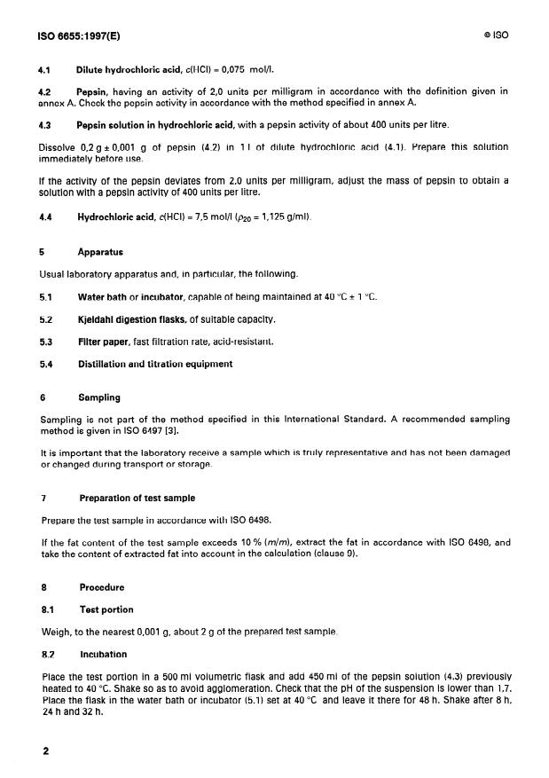 - Principle: Incubate a prepared feed test portion with a pepsin solution in dilute HCl, filter, then determine nitrogen in the filtrate or in the residue by the Kjeldahl method (see ISO 5983).