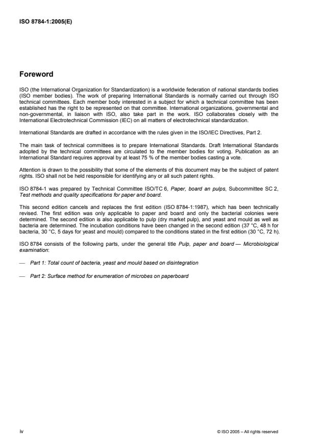 ISO 8784-1:2005 is a standard published by the International Organization for Standardization (ISO). Its full title is "Pulp, paper and board — Microbiological examination — Part 1: Total count of bacteria, yeast and mould based on disintegration". This standard covers: ISO 8784-1:2005 specifies a method for determining the total number of colony-forming units of bacteria, yeast and moulds in dry market pulp, paper and paperboard after disintegration. The enumeration relates to specific media. ISO 8784-1:2005 is applicable to most kinds of paper and paperboard, especially those grades intended to come into contact with foodstuffs.