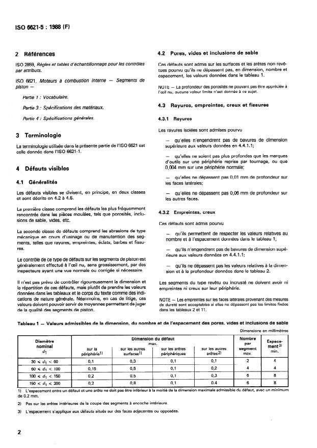 La présente partie de l'ISO 6621 spécifie des aspects qualitatifs qui ne figurent pas généralement sur une spécification de dessin mais sont néanmoins susceptibles d'être définis. Elle s'applique aux types de segments suivants : segments monopièces en fonte grise, grise carbidique, malléable, à graphite sphéroïdal, ou en acier ; segments multipièces (segments racleurs régulateurs d'huile) composés de parties en fonte et de ressorts ; segments monopièces et multipièces en acier, c'est-à-dire segments racleurs régulateurs d'huile sous forme de bandes ou de segments (rails) en acier et d'éléments extensibles du type ressorts. Outre la spécification de certaines limites de réception liées aux principes de mesurage en cours de contrôle (voir ISO 6621-2), la présente partie de l'ISO 6621 porte également sur certaines caractéristiques pour lesquelles il n'existe aucun mode opératoire de mesure quantitative reconnu et qui ne sont vérifiées qu'à l'oeil nu (ou corrigé par des lunettes de vue normales) et sans grossissement. Ces caractéristiques (défauts superficiels) viennent sajouter aux tolérances normalisees portant sur la hauteur du segment, son épaisseur radiale et son jeu à la coupe. La présente partie de IISO 6621 ne spécifie pas de niveaux de qualité acceptable (NQA), la responsabilité conjointe du niveau acceptable retenu étant laissée au fabricant et à lacheteur. Dans ce cas, les recommandations de IISO 2859 devraient être suivies. Les spécifications de la présente partie de IISO 6621 sappliquent à tous les types de segments ayant un diamétre inférieur ou égal à 200 mm, indiqués dans la classification ci-dessus et utilisés dans les moteurs alternatifs à combustion interne et les compresseurs.