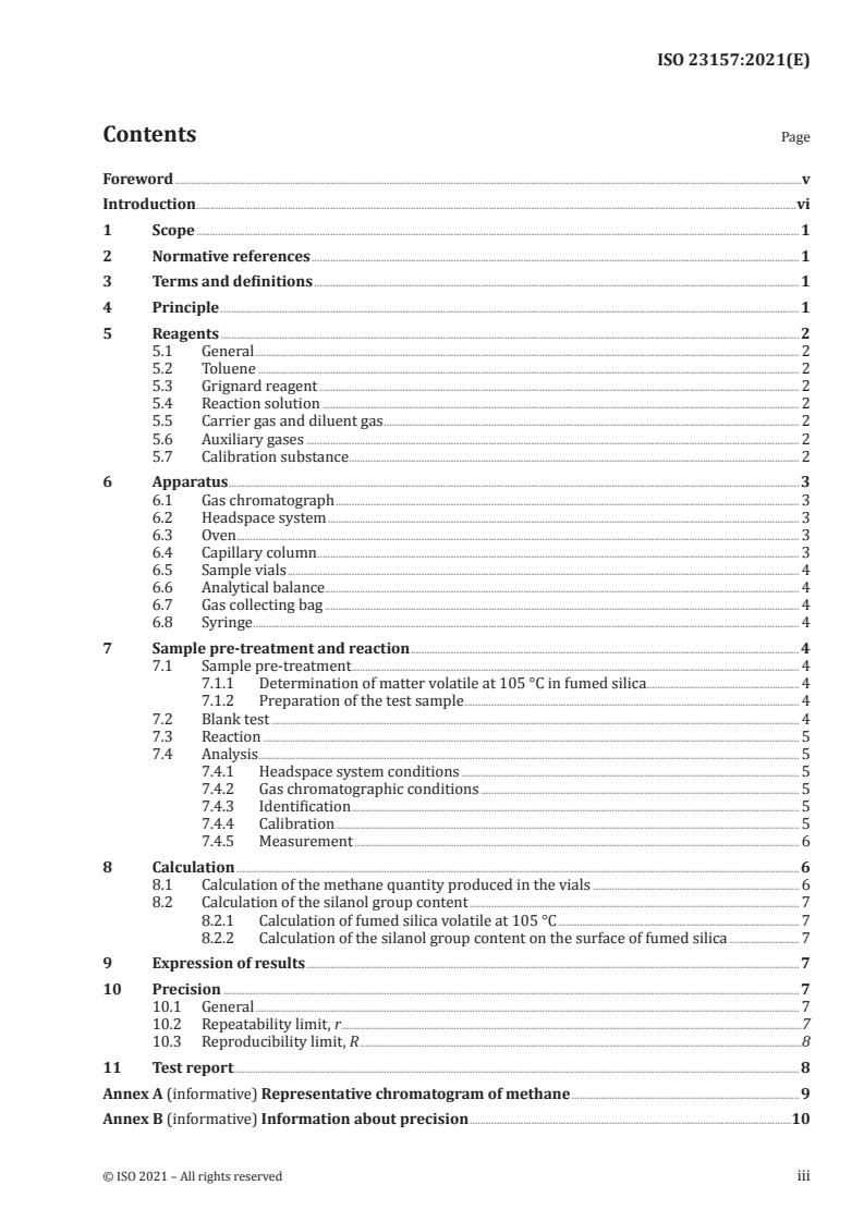 - The introduction notes alternative methods (titration, TG, IR) for silanol determination; ISO 23157:2021 is preferred where higher sensitivity and reproducibility are required.