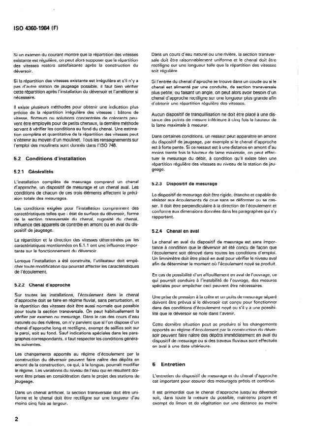 ISO 4360:1984 is a standard published by the International Organization for Standardization (ISO). Its full title is "Liquid flow measurement in open channels by weirs and flumes — Triangular profile weirs". This standard covers: Specifies methods for the measurement of the flow of water in open channels under steady flow conditions using triangular profile weirs. The flow conditions considered are steady flows which are uniquely dependent on the upstream head and drowned flows which depend on downstream as well as upstream levels.