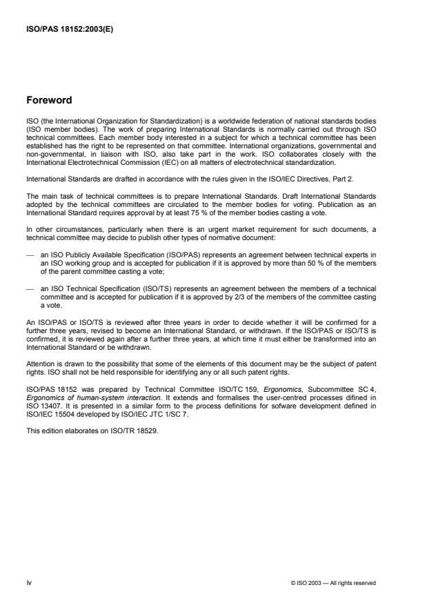 ISO/PAS 18152:2003 presents a human-systems (HS) model for use in ISO/IEC 15504-conformant assessment of the maturity of an organization in performing the processes that make a system usable, healthy and safe. It describes processes that address human-system issues and the outcomes of these processes. It details the practices and work products associated with achieving the outcomes of each process.