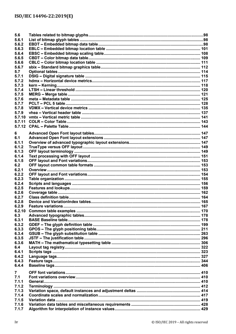The standard is comprehensive and structured around the OFF file model and individual font tables. Key technical topics include: