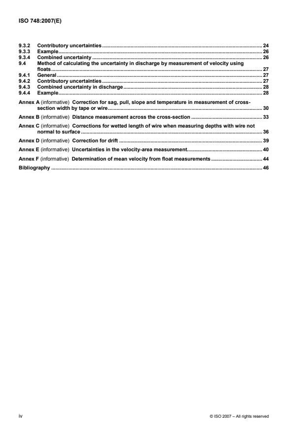 ISO 748:2007 specifies methods for determining the velocity and cross‑sectional area of water flowing in open channels without ice cover, and for computing the discharge therefrom. ISO 748:2007 covers methods of employing current‑meters or floats to measure the velocities. It deals only with single measurements of the discharge; the continuous recording of discharges over a period of time is covered in ISO 1100-1 and ISO 1100-2.