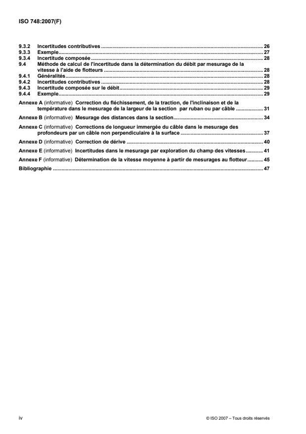 L'ISO 748:2007 spécifie des méthodes permettant de déterminer la vitesse et l'aire de la section droite d'un écoulement d'eau en chenal non couvert par la glace et de calculer le débit à partir des résultats des mesurages. Elle couvre les méthodes faisant usage de moulinets ou de flotteurs destinés au mesurage des vitesses. Il est à noter que, bien que dans certains cas ces mesurages soient entrepris pour déterminer la relation hauteur-débit d'une station hydrométrique, l'ISO 748:2007 ne traite que de simples mesurages du débit; l'enregistrement en continu des débits durant une certaine période fait l'objet de l'ISO 1100‑1 et de l'ISO 1100‑2.