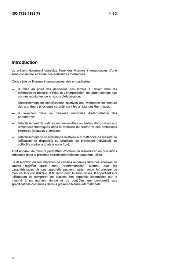 ISO 7726:1998 is a standard published by the International Organization for Standardization (ISO). Its full title is "Ergonomics of the thermal environment - Instruments for measuring physical quantities". This standard covers: La présente Norme internationale spécifie les caractéristiques minimales des appareils de mesure des grandeurs physiques d'une ambiance, ainsi que les méthodes de mesure des grandeurs physiques de cette ambiance. Elle n'a pas pour but de définir un indice global de confort ou de contrainte thermique, mais simplement de normaliser la prise des informations devant conduire à de tels indices. D'autres Normes internationales précisent les méthodes permettant d'exploiter les informations recueillies conformément à la présente norme. La présente Norme internationale pourra servir de référence pour la constitution a) d'un cahier des charges pour les constructeurs et les utilisateurs d'appareils de mesure des grandeurs physiques de l'environnement; b) d'un document contractuel entre deux parties pour la mesure de ces grandeurs. Elle s'applique à l'influence des ambiances chaudes, confortables ou froides sur les personnes.