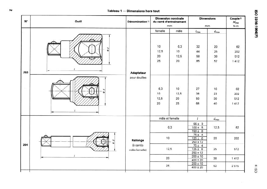 ISO 1174-I : 1996, Outils de manœuvre pour vis et écrous - Carrés d’entraînement - Partie 1: Carrés d’entraînement