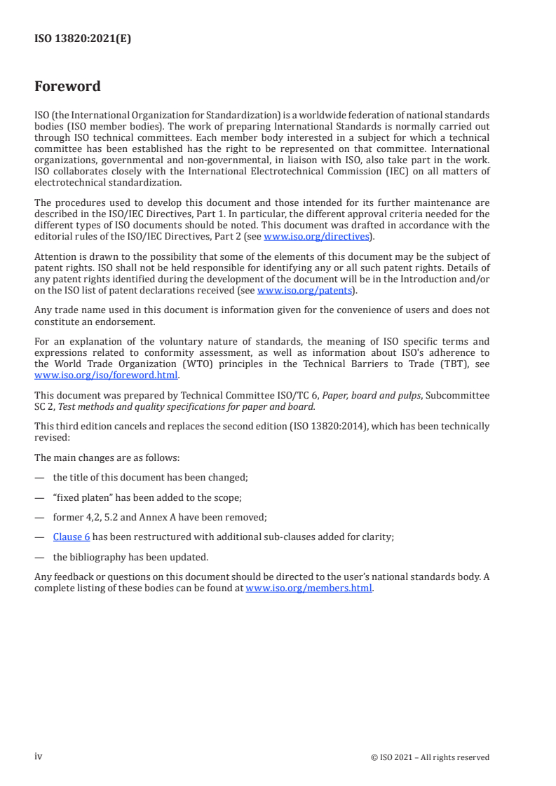 ISO 13820:2021 is a standard published by the International Organization for Standardization (ISO). Its full title is "Paper, board and corrugated fibreboard — Description and calibration of fixed platen compression-testing equipment". This standard covers: This document specifies the essential characteristics and the principles of calibration of fixed platen compression testing equipment used in the testing of paper, board, and corrugated fibreboard.