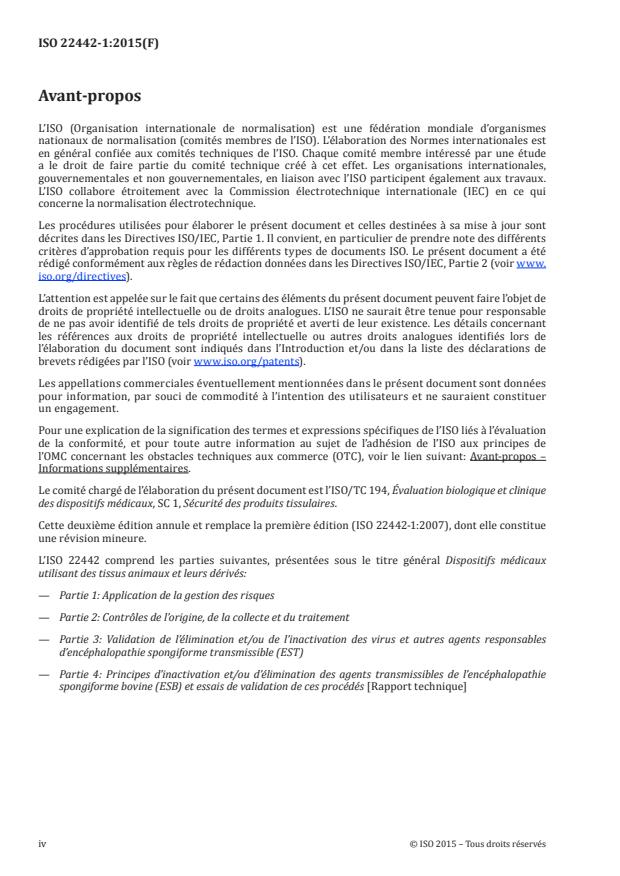 ISO 22442-1:2015 applies to medical devices other than in vitro diagnostic medical devices manufactured utilizing materials of animal origin, which are non-viable or have been rendered non-viable. It specifies, in conjunction with ISO 14971, a procedure to identify the hazards and hazardous situations associated with such devices, to estimate and evaluate the resulting risks, to control these risks, and to monitor the effectiveness of that control. Furthermore, it outlines the decision process for the residual risk acceptability, taking into account the balance of residual risk, as defined in ISO 14971, and expected medical benefit as compared to available alternatives. This part of ISO 22442 is intended to provide requirements and guidance on risk management related to the hazards typical of medical devices manufactured utilizing animal tissues or derivatives such as a) contamination by bacteria, moulds or yeasts; b) contamination by viruses; c) contamination by agents causing Transmissible Spongiform Encephalopathies (TSE); d) material responsible for undesired pyrogenic, immunological or toxicological reactions. For parasites and other unclassified pathogenic entities, similar principles can apply. ISO 22442-1:2015 does not stipulate levels of acceptability which, because they are determined by a multiplicity of factors, cannot be set down in such an International Standard except for some particular derivatives mentioned in Annex C. Annex C stipulates levels of TSE risk acceptability for tallow derivatives, animal charcoal, milk and milk derivatives, wool derivatives and amino acids. ISO 22442-1:2015 does not specify a quality management system for the control of all stages of production of medical devices. ISO 22442-1:2015 does not cover the utilization of human tissues in medical devices. NOTE 1 It is not a requirement of this part of ISO 22442 to have a full quality management system during manufacture. However, attention is drawn to International Standards for quality management systems (see ISO 13485) that control all stages of production or reprocessing of medical devices. NOTE 2 For guidance on the application of this part of ISO 22442, see Annex A.