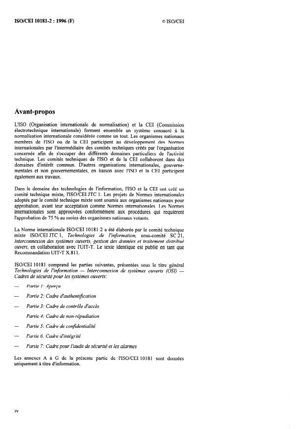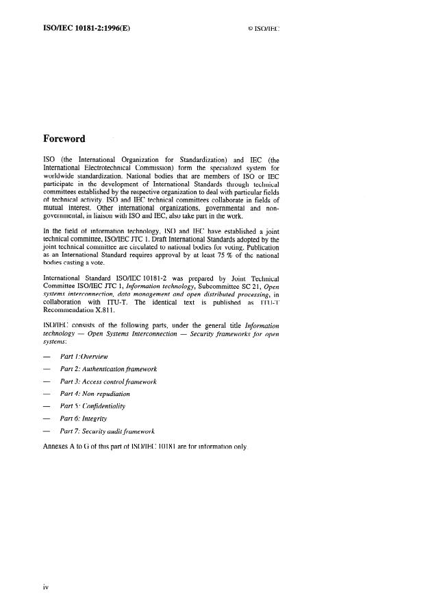 ISO/IEC 10181-2:1996 is a standard published by the International Organization for Standardization (ISO). Its full title is "Information technology — Open Systems Interconnection — Security frameworks for open systems: Authentication framework". This standard covers: Addresses the application of security services in an Open Systems environment, where the term Open Systems is taken to include areas such as Database, Distributed Applications, Open Distributed Processing and OSI.
