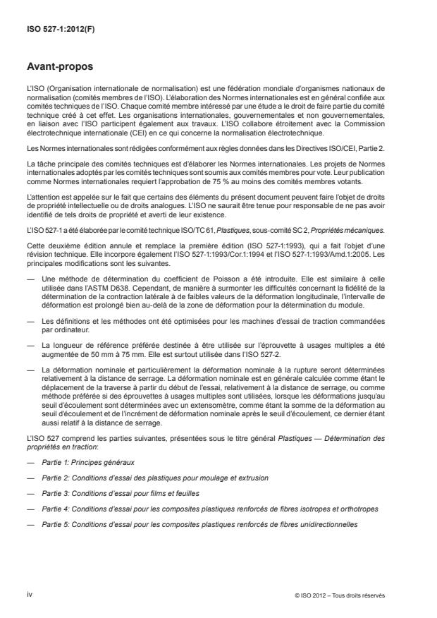 L'ISO 527-1:2012 spécifie les principes généraux pour la détermination des propriétés en traction des plastiques et des composites en plastique dans des conditions définies. Plusieurs types différents d'éprouvettes sont définis en fonction des différents types de matériaux qui sont énumérés dans les parties suivantes de I'ISO 527. Les méthodes sont utilisées pour étudier le comportement en traction des éprouvettes par la détermination de la résistance en traction, du module d'élasticité en traction et d'autres aspects de la relation contrainte/déformation en traction dans des conditions définies. En principe, les méthodes ne peuvent pas être appliquées aux matériaux alvéolaires rigides, pour lesquels l'ISO 1926 est utilisée, ou aux structures sandwichs contenant des matériaux alvéolaires.