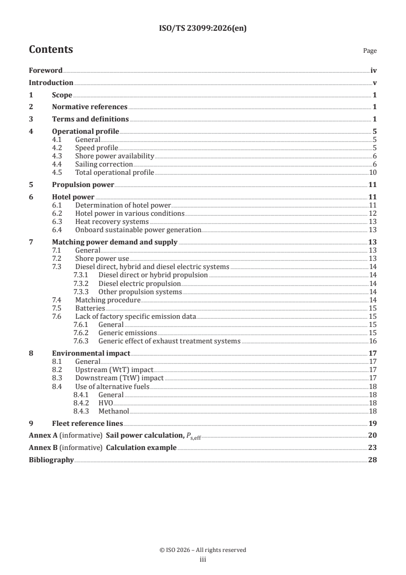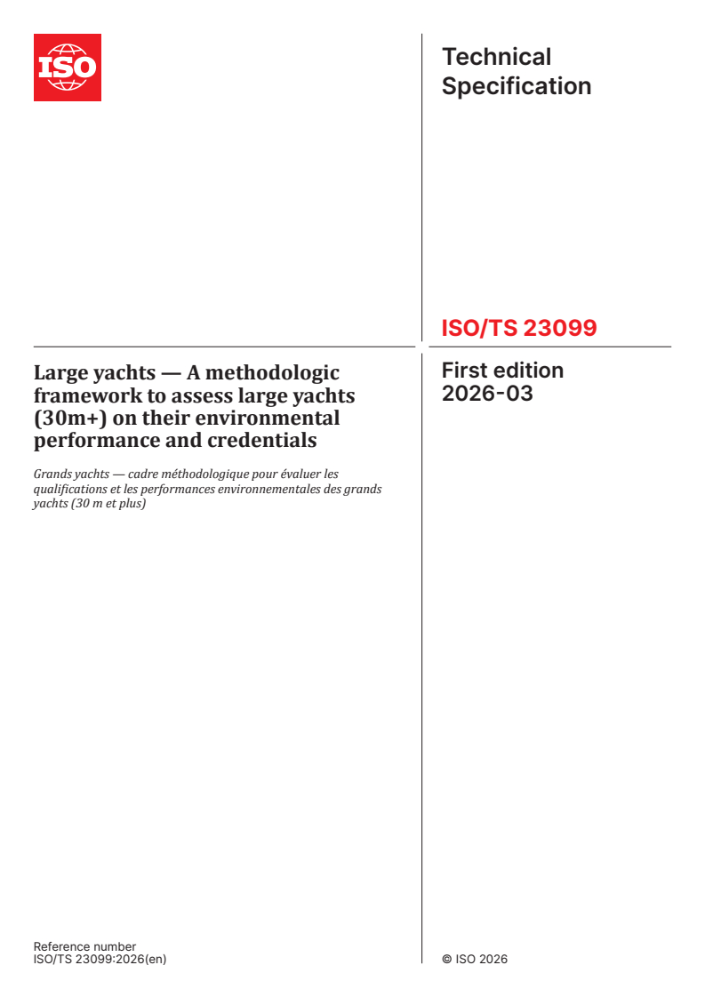 ISO/TS 23099:2026 is a technical specification published by the International Organization for Standardization (ISO). Its full title is "Large yachts — A methodologic framework to assess large yachts (30m+) on their environmental performance and credentials". This standard covers: This document specifies a methodology to calculate the environmental impact of operational energy use for large yachts and enables the comparative assessment of a yacht's environmental performance against a defined baseline fleet. The method established herein is robust and based on the best available data, with transparency and comparability across various yacht types and technical characteristics. This document explicitly addresses operational energy consumption during the yacht's use phase, emphasizing the efficiency of onboard systems benchmarked against the found average operational profile and the environmental emissions coming from this energy, both upstream and downstream. It excludes behavioural variables arising from individual yacht operation patterns. Additionally, the production and maintenance materials and processes (upstream impacts), as well as yacht end-of-life considerations (part of downstream impacts), are outside the scope of this document. The operational profile specified in this document assumes that the yacht is professionally crewed year-round and capable of independent transoceanic voyages. NOTE For motor yachts, this operational assumption generally aligns with IMO MARPOL requirements, which apply to ships exceeding 400 GT that must be surveyed and certified for MARPOL compliance. Sailing yachts typically exhibit lower GT for equivalent length; however, their cruising behaviours align closely with motor yachts of comparable length.