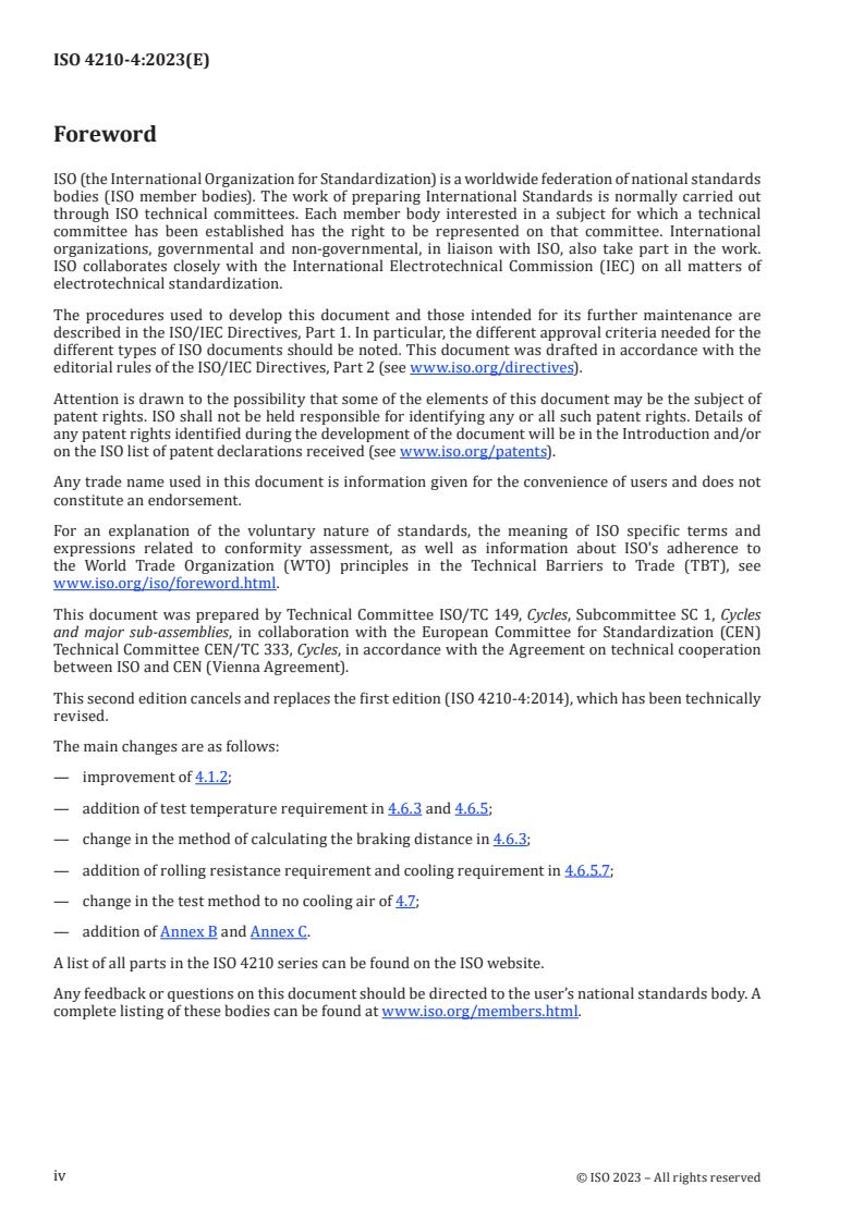 - ISO 4210‑2:2023 (Requirements for city/trekking, young adult, mountain and racing bicycles) - ISO 4210‑4 provides the braking test methods that support ISO 4210‑2 compliance.