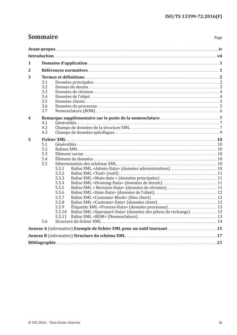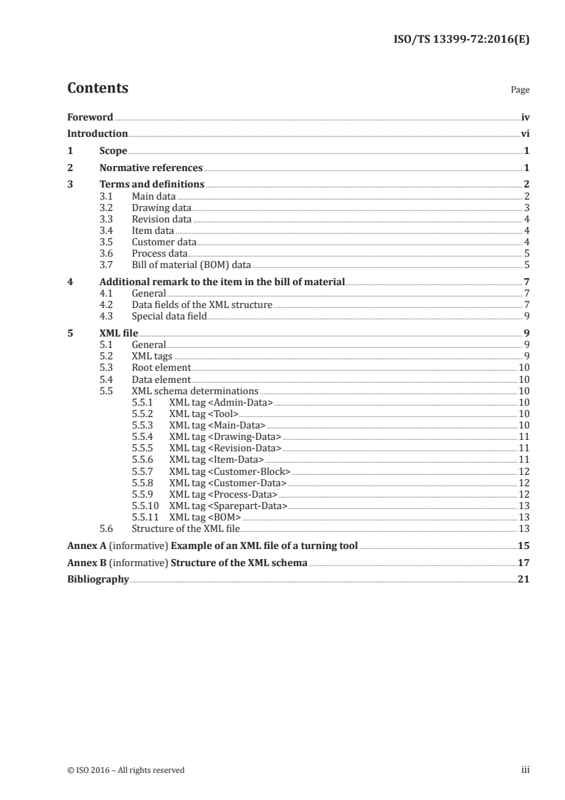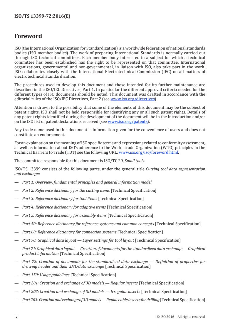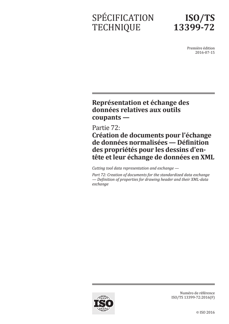 ISO/TS 13399-72:2016 is a technical specification published by the International Organization for Standardization (ISO). Its full title is "Cutting tool data representation and exchange — Part 72: Creation of documents for the standardized data exchange — Definition of properties for drawing header and their XML-data exchange". This standard covers: ISO/TS 13399-72:2016 defines the necessary text elements of a drawing frame and determines a standardized data exchange format. Therefore, the effort is reduced for the maintenance of documentation because the content of a drawing header is mated into a specific drawing frame by means of using XML technology and an individual mapping table. The benefit of this concept for manufacturer/supplier and end user is the advantage of a central maintenance of the appropriate templates. It covers the following: - identification and definition of the data fields; - identification and definition of the structure of the data fields; - structure of the data exchange file. The standardization of drawing formats, e.g. drawing frame, structure of the bill of material, are outside the scope of ISO/TS 13399-72:2016 which is rather more intended to standardize the data exchange of the product documentations. The following are outside the scope of ISO/TS 13399-72:2016; - layer settings as defined in ISO/TS 13399‑70; - structure of the tool documentation as defined in ISO/TS 13399‑71; - applications where these standard data may be stored or referenced; - concept of the classification of cutting tool data and their properties; - concept of the design of 2D drawings for cutting tools; - concept of the design of 3D models for cutting tools; - application data for the use of those cutting tools; - information about the reconditioning of cutting tools; - information about additional application and usage data (e.g. coolant supply).