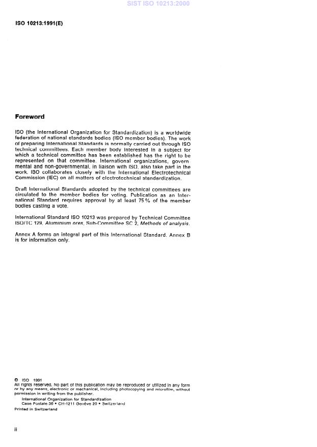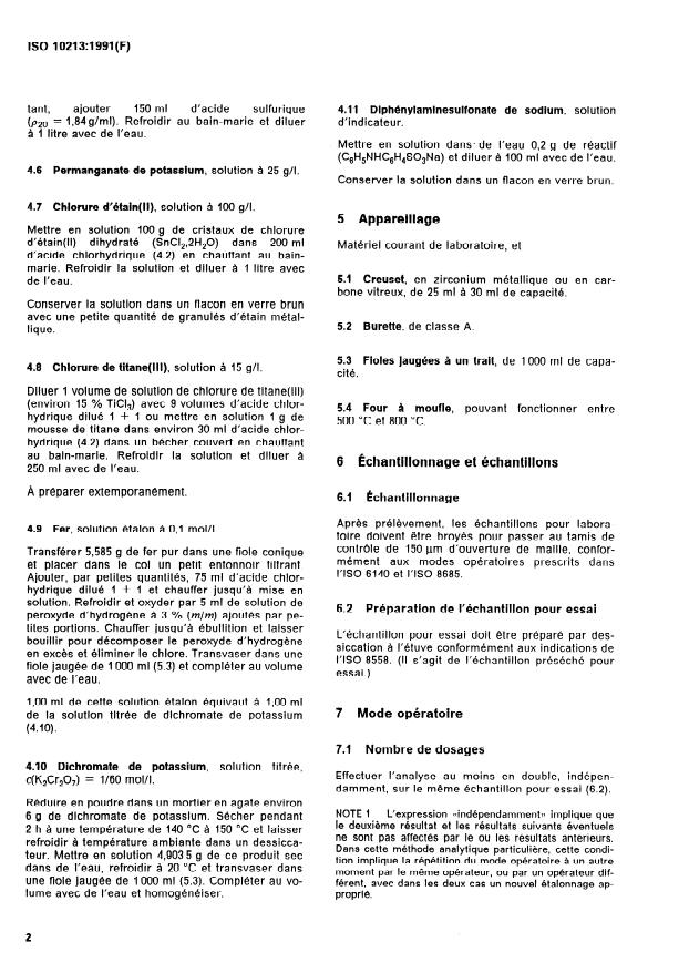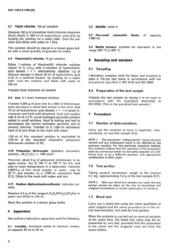ISO 10213:1991 is a standard published by the International Organization for Standardization (ISO). Its full title is "Aluminium ores — Determination of total iron content — Titanium trichloride reduction method". This standard covers: Specifies a titrimetric method, free from mercury pollution, using potassium dichromate as titrant after reduction of the trivalent iron by tin(II) chloride and titanium(III) chloride. Applies to ores containing between 2 % and 50 % of iron oxide.